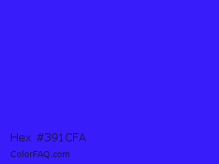 Hex #391cfa Color is a normal indigo color and the nearest color is Han Purple #5218fa. Hex code #391cfa and RGB value is rgb(57,28,250). In RGB color space, this color is composed of 22% red, 11% green, 98% blue, In CMYK color space, this color is composed of 77% cyan, 89% magenta, 0% yellow , 2% black , In HSL color space, this color has a hue angle of 248° , 96% saturation and 55% lightness.