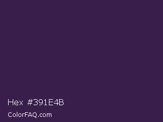 Hex #391e4b Color is a very dark purple color and the nearest color is Deep Grape #381a51. Hex code #391e4b and RGB value is rgb(57,30,75). In RGB color space, this color is composed of 22% red, 12% green, 29% blue, In CMYK color space, this color is composed of 24% cyan, 60% magenta, 0% yellow , 71% black , In HSL color space, this color has a hue angle of 276° , 43% saturation and 21% lightness.