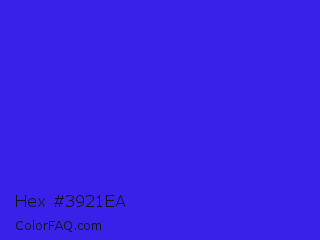 Hex #3921ea Color is a normal indigo color and the nearest color is Bluebonnet #1c1cf0. Hex code #3921ea and RGB value is rgb(57,33,234). In RGB color space, this color is composed of 22% red, 13% green, 92% blue, In CMYK color space, this color is composed of 76% cyan, 86% magenta, 0% yellow , 8% black , In HSL color space, this color has a hue angle of 247° , 83% saturation and 52% lightness.