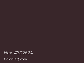 Hex #39262a Color is a very dark red color and the nearest color is Thunder #33292f. Hex code #39262a and RGB value is rgb(57,38,42). In RGB color space, this color is composed of 22% red, 15% green, 16% blue, In CMYK color space, this color is composed of 0% cyan, 33% magenta, 26% yellow , 78% black , In HSL color space, this color has a hue angle of 347° , 20% saturation and 19% lightness.
