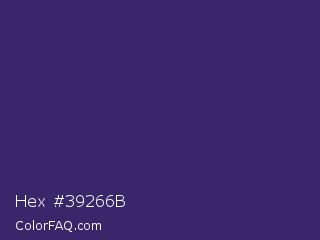 Hex #39266b Color is a dark indigo color and the nearest color is Jacarta #3a2a6a. Hex code #39266b and RGB value is rgb(57,38,107). In RGB color space, this color is composed of 22% red, 15% green, 42% blue, In CMYK color space, this color is composed of 47% cyan, 64% magenta, 0% yellow , 58% black , In HSL color space, this color has a hue angle of 257° , 48% saturation and 28% lightness.