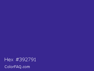 Hex #392791 Color is a normal indigo color and the nearest color is Cosmic Cobalt #2e2d88. Hex code #392791 and RGB value is rgb(57,39,145). In RGB color space, this color is composed of 22% red, 15% green, 57% blue, In CMYK color space, this color is composed of 61% cyan, 73% magenta, 0% yellow , 43% black , In HSL color space, this color has a hue angle of 250° , 58% saturation and 36% lightness.