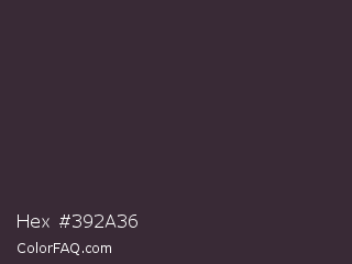 Hex #392a36 Color is a very dark magenta color and the nearest color is Blackcurrant #32293a. Hex code #392a36 and RGB value is rgb(57,42,54). In RGB color space, this color is composed of 22% red, 16% green, 21% blue, In CMYK color space, this color is composed of 0% cyan, 26% magenta, 5% yellow , 78% black , In HSL color space, this color has a hue angle of 312° , 15% saturation and 19% lightness.