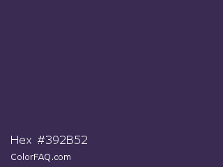 Hex #392b52 Color is a dark violet color and the nearest color is Martinique #363050. Hex code #392b52 and RGB value is rgb(57,43,82). In RGB color space, this color is composed of 22% red, 17% green, 32% blue, In CMYK color space, this color is composed of 30% cyan, 48% magenta, 0% yellow , 68% black , In HSL color space, this color has a hue angle of 262° , 31% saturation and 25% lightness.