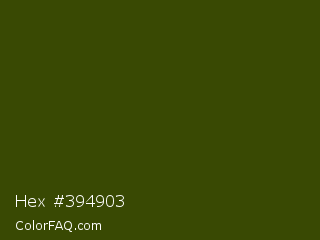 Hex #394903 Color is a very dark lime color and the nearest color is Clover #384910. Hex code #394903 and RGB value is rgb(57,73,3). In RGB color space, this color is composed of 22% red, 29% green, 1% blue, In CMYK color space, this color is composed of 22% cyan, 0% magenta, 96% yellow , 71% black , In HSL color space, this color has a hue angle of 74° , 92% saturation and 15% lightness.