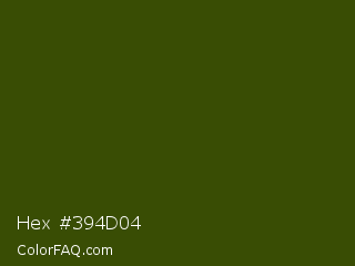 Hex #394d04 Color is a very dark lime color and the nearest color is Clover #384910. Hex code #394d04 and RGB value is rgb(57,77,4). In RGB color space, this color is composed of 22% red, 30% green, 2% blue, In CMYK color space, this color is composed of 26% cyan, 0% magenta, 95% yellow , 70% black , In HSL color space, this color has a hue angle of 76° , 90% saturation and 16% lightness.