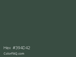 Hex #394d42 Color is a dark green color and the nearest color is Lunar Green #3c493a. Hex code #394d42 and RGB value is rgb(57,77,66). In RGB color space, this color is composed of 22% red, 30% green, 26% blue, In CMYK color space, this color is composed of 26% cyan, 0% magenta, 14% yellow , 70% black , In HSL color space, this color has a hue angle of 147° , 15% saturation and 26% lightness.