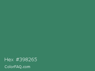 Hex #398265 Color is a normal green color and the nearest color is Viridian #40826d. Hex code #398265 and RGB value is rgb(57,130,101). In RGB color space, this color is composed of 22% red, 51% green, 40% blue, In CMYK color space, this color is composed of 56% cyan, 0% magenta, 22% yellow , 49% black , In HSL color space, this color has a hue angle of 156° , 39% saturation and 37% lightness.