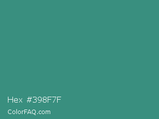 Hex #398f7f Color is a normal cyan color and the nearest color is Illuminating Emerald #319177. Hex code #398f7f and RGB value is rgb(57,143,127). In RGB color space, this color is composed of 22% red, 56% green, 50% blue, In CMYK color space, this color is composed of 60% cyan, 0% magenta, 11% yellow , 44% black , In HSL color space, this color has a hue angle of 169° , 43% saturation and 39% lightness.