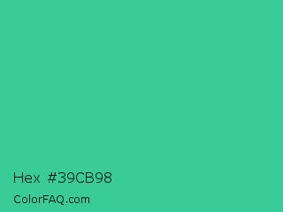 Hex #39cb98 Color is a normal green color and the nearest color is Shamrock #33cc99. Hex code #39cb98 and RGB value is rgb(57,203,152). In RGB color space, this color is composed of 22% red, 80% green, 60% blue, In CMYK color space, this color is composed of 72% cyan, 0% magenta, 25% yellow , 20% black , In HSL color space, this color has a hue angle of 159° , 58% saturation and 51% lightness.