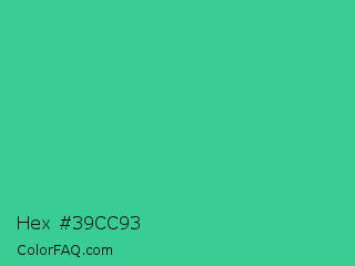 Hex #39cc93 Color is a normal green color and the nearest color is Shamrock #33cc99. Hex code #39cc93 and RGB value is rgb(57,204,147). In RGB color space, this color is composed of 22% red, 80% green, 58% blue, In CMYK color space, this color is composed of 72% cyan, 0% magenta, 28% yellow , 20% black , In HSL color space, this color has a hue angle of 157° , 59% saturation and 51% lightness.