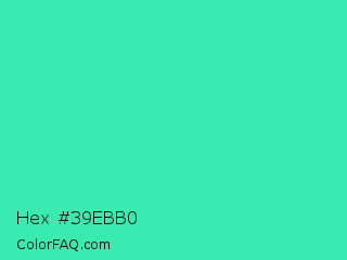 Hex #39ebb0 Color is a normal green color and the nearest color is Eucalyptus #44d7a8. Hex code #39ebb0 and RGB value is rgb(57,235,176). In RGB color space, this color is composed of 22% red, 92% green, 69% blue, In CMYK color space, this color is composed of 76% cyan, 0% magenta, 25% yellow , 8% black , In HSL color space, this color has a hue angle of 160° , 82% saturation and 57% lightness.