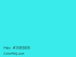 Hex #39ebeb Color is a normal cyan color and the nearest color is Turquoise #40e0d0. Hex code #39ebeb and RGB value is rgb(57,235,235). In RGB color space, this color is composed of 22% red, 92% green, 92% blue, In CMYK color space, this color is composed of 76% cyan, 0% magenta, 0% yellow , 8% black , In HSL color space, this color has a hue angle of 180° , 82% saturation and 57% lightness.