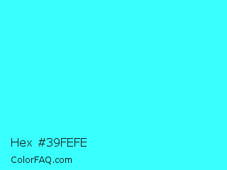 Hex #39fefe Color is a light cyan color and the nearest color is Loeen #15f2fd. Hex code #39fefe and RGB value is rgb(57,254,254). In RGB color space, this color is composed of 22% red, 100% green, 100% blue, In CMYK color space, this color is composed of 78% cyan, 0% magenta, 0% yellow , 0% black , In HSL color space, this color has a hue angle of 180° , 99% saturation and 61% lightness.