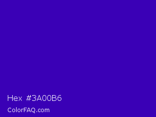 Hex #3a00b6 Color is a normal indigo color and the nearest color is Interdimensional Blue #360ccc. Hex code #3a00b6 and RGB value is rgb(58,0,182). In RGB color space, this color is composed of 23% red, 0% green, 71% blue, In CMYK color space, this color is composed of 68% cyan, 100% magenta, 0% yellow , 29% black , In HSL color space, this color has a hue angle of 259° , 100% saturation and 36% lightness.
