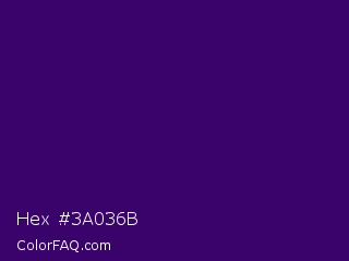 Hex #3a036b Color is a very dark purple color and the nearest color is Christalle #33036b. Hex code #3a036b and RGB value is rgb(58,3,107). In RGB color space, this color is composed of 23% red, 1% green, 42% blue, In CMYK color space, this color is composed of 46% cyan, 97% magenta, 0% yellow , 58% black , In HSL color space, this color has a hue angle of 272° , 95% saturation and 22% lightness.