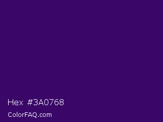 Hex #3a0768 Color is a very dark purple color and the nearest color is Christalle #33036b. Hex code #3a0768 and RGB value is rgb(58,7,104). In RGB color space, this color is composed of 23% red, 3% green, 41% blue, In CMYK color space, this color is composed of 44% cyan, 93% magenta, 0% yellow , 59% black , In HSL color space, this color has a hue angle of 272° , 87% saturation and 22% lightness.