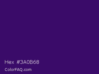 Hex #3a0b68 Color is a dark violet color and the nearest color is Christalle #33036b. Hex code #3a0b68 and RGB value is rgb(58,11,104). In RGB color space, this color is composed of 23% red, 4% green, 41% blue, In CMYK color space, this color is composed of 44% cyan, 89% magenta, 0% yellow , 59% black , In HSL color space, this color has a hue angle of 270° , 81% saturation and 23% lightness.