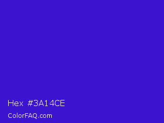Hex #3a14ce Color is a normal indigo color and the nearest color is Interdimensional Blue #360ccc. Hex code #3a14ce and RGB value is rgb(58,20,206). In RGB color space, this color is composed of 23% red, 8% green, 81% blue, In CMYK color space, this color is composed of 72% cyan, 90% magenta, 0% yellow , 19% black , In HSL color space, this color has a hue angle of 252° , 82% saturation and 44% lightness.