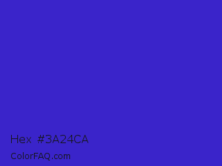 Hex #3a24ca Color is a normal indigo color and the nearest color is Interdimensional Blue #360ccc. Hex code #3a24ca and RGB value is rgb(58,36,202). In RGB color space, this color is composed of 23% red, 14% green, 79% blue, In CMYK color space, this color is composed of 71% cyan, 82% magenta, 0% yellow , 21% black , In HSL color space, this color has a hue angle of 248° , 70% saturation and 47% lightness.