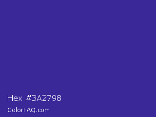 Hex #3a2798 Color is a normal indigo color and the nearest color is Blue Pigment #333399. Hex code #3a2798 and RGB value is rgb(58,39,152). In RGB color space, this color is composed of 23% red, 15% green, 60% blue, In CMYK color space, this color is composed of 62% cyan, 74% magenta, 0% yellow , 40% black , In HSL color space, this color has a hue angle of 250° , 59% saturation and 37% lightness.