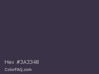 Hex #3a3348 Color is a dark indigo color and the nearest color is Tuna #353542. Hex code #3a3348 and RGB value is rgb(58,51,72). In RGB color space, this color is composed of 23% red, 20% green, 28% blue, In CMYK color space, this color is composed of 19% cyan, 29% magenta, 0% yellow , 72% black , In HSL color space, this color has a hue angle of 260° , 17% saturation and 24% lightness.