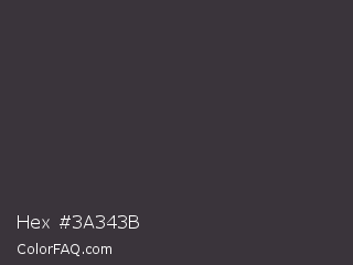 Hex #3a343b Color is a very dark purple color and the nearest color is Onyx #353839. Hex code #3a343b and RGB value is rgb(58,52,59). In RGB color space, this color is composed of 23% red, 20% green, 23% blue, In CMYK color space, this color is composed of 2% cyan, 12% magenta, 0% yellow , 77% black , In HSL color space, this color has a hue angle of 291° , 6% saturation and 22% lightness.