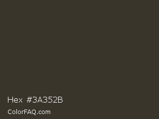 Hex #3a352b Color is a very dark orange color and the nearest color is Dune #383533. Hex code #3a352b and RGB value is rgb(58,53,43). In RGB color space, this color is composed of 23% red, 21% green, 17% blue, In CMYK color space, this color is composed of 0% cyan, 9% magenta, 26% yellow , 77% black , In HSL color space, this color has a hue angle of 40° , 15% saturation and 20% lightness.
