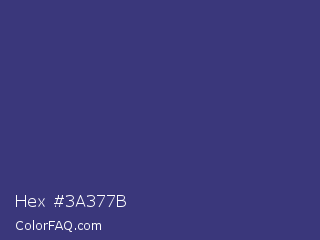 Hex #3a377b Color is a normal indigo color and the nearest color is Minsk #3f307f. Hex code #3a377b and RGB value is rgb(58,55,123). In RGB color space, this color is composed of 23% red, 22% green, 48% blue, In CMYK color space, this color is composed of 53% cyan, 55% magenta, 0% yellow , 52% black , In HSL color space, this color has a hue angle of 243° , 38% saturation and 35% lightness.