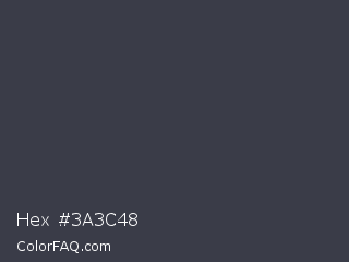 Hex #3a3c48 Color is a dark blue color and the nearest color is Ship Gray #3e3a44. Hex code #3a3c48 and RGB value is rgb(58,60,72). In RGB color space, this color is composed of 23% red, 24% green, 28% blue, In CMYK color space, this color is composed of 19% cyan, 17% magenta, 0% yellow , 72% black , In HSL color space, this color has a hue angle of 231° , 11% saturation and 25% lightness.