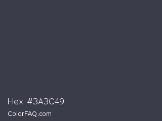 Hex #3a3c49 Color is a dark blue color and the nearest color is Ship Gray #3e3a44. Hex code #3a3c49 and RGB value is rgb(58,60,73). In RGB color space, this color is composed of 23% red, 24% green, 29% blue, In CMYK color space, this color is composed of 21% cyan, 18% magenta, 0% yellow , 71% black , In HSL color space, this color has a hue angle of 232° , 11% saturation and 26% lightness.