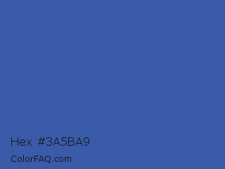 Hex #3a5ba9 Color is a normal blue color and the nearest color is Azure #315ba1. Hex code #3a5ba9 and RGB value is rgb(58,91,169). In RGB color space, this color is composed of 23% red, 36% green, 66% blue, In CMYK color space, this color is composed of 66% cyan, 46% magenta, 0% yellow , 34% black , In HSL color space, this color has a hue angle of 222° , 49% saturation and 45% lightness.