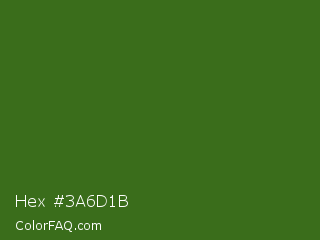 Hex #3a6d1b Color is a dark green color and the nearest color is Dell #396413. Hex code #3a6d1b and RGB value is rgb(58,109,27). In RGB color space, this color is composed of 23% red, 43% green, 11% blue, In CMYK color space, this color is composed of 47% cyan, 0% magenta, 75% yellow , 57% black , In HSL color space, this color has a hue angle of 97° , 60% saturation and 27% lightness.