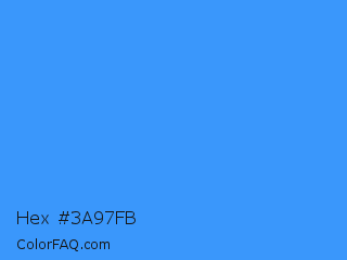 Hex #3a97fb Color is a light blue color and the nearest color is Brilliant Azure #3399ff. Hex code #3a97fb and RGB value is rgb(58,151,251). In RGB color space, this color is composed of 23% red, 59% green, 98% blue, In CMYK color space, this color is composed of 77% cyan, 40% magenta, 0% yellow , 2% black , In HSL color space, this color has a hue angle of 211° , 96% saturation and 61% lightness.