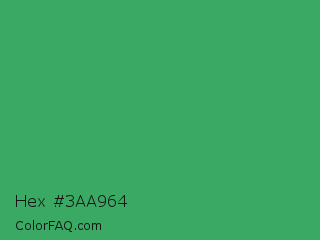 Hex #3aa964 Color is a normal green color and the nearest color is Chateau Green #40a860. Hex code #3aa964 and RGB value is rgb(58,169,100). In RGB color space, this color is composed of 23% red, 66% green, 39% blue, In CMYK color space, this color is composed of 66% cyan, 0% magenta, 41% yellow , 34% black , In HSL color space, this color has a hue angle of 143° , 49% saturation and 45% lightness.