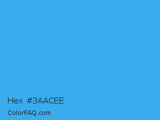 Hex #3aacee Color is a normal blue color and the nearest color is Picton Blue #45b1e8. Hex code #3aacee and RGB value is rgb(58,172,238). In RGB color space, this color is composed of 23% red, 67% green, 93% blue, In CMYK color space, this color is composed of 76% cyan, 28% magenta, 0% yellow , 7% black , In HSL color space, this color has a hue angle of 202° , 84% saturation and 58% lightness.