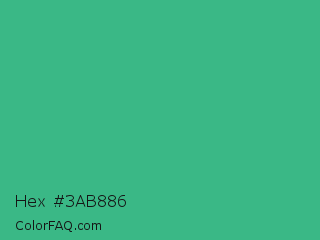 Hex #3ab886 Color is a normal green color and the nearest color is Mint #3eb489. Hex code #3ab886 and RGB value is rgb(58,184,134). In RGB color space, this color is composed of 23% red, 72% green, 53% blue, In CMYK color space, this color is composed of 68% cyan, 0% magenta, 27% yellow , 28% black , In HSL color space, this color has a hue angle of 156° , 52% saturation and 47% lightness.