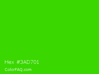 Hex #3ad701 Color is a normal green color and the nearest color is Harlequin Green #46cb18. Hex code #3ad701 and RGB value is rgb(58,215,1). In RGB color space, this color is composed of 23% red, 84% green, 0% blue, In CMYK color space, this color is composed of 73% cyan, 0% magenta, 100% yellow , 16% black , In HSL color space, this color has a hue angle of 104° , 99% saturation and 42% lightness.
