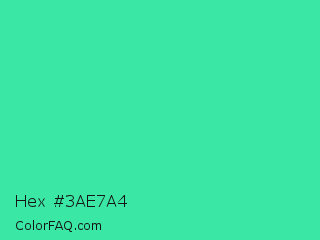 Hex #3ae7a4 Color is a normal green color and the nearest color is Eucalyptus #44d7a8. Hex code #3ae7a4 and RGB value is rgb(58,231,164). In RGB color space, this color is composed of 23% red, 91% green, 64% blue, In CMYK color space, this color is composed of 75% cyan, 0% magenta, 29% yellow , 9% black , In HSL color space, this color has a hue angle of 157° , 78% saturation and 57% lightness.