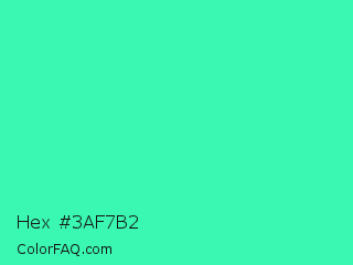 Hex #3af7b2 Color is a normal green color and the nearest color is Eucalyptus #44d7a8. Hex code #3af7b2 and RGB value is rgb(58,247,178). In RGB color space, this color is composed of 23% red, 97% green, 70% blue, In CMYK color space, this color is composed of 77% cyan, 0% magenta, 28% yellow , 3% black , In HSL color space, this color has a hue angle of 158° , 92% saturation and 60% lightness.