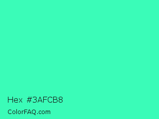 Hex #3afcb8 Color is a light green color and the nearest color is Turquoise #40e0d0. Hex code #3afcb8 and RGB value is rgb(58,252,184). In RGB color space, this color is composed of 23% red, 99% green, 72% blue, In CMYK color space, this color is composed of 77% cyan, 0% magenta, 27% yellow , 1% black , In HSL color space, this color has a hue angle of 159° , 97% saturation and 61% lightness.