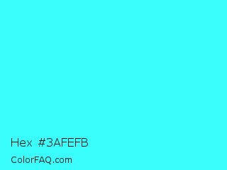 Hex #3afefb Color is a light cyan color and the nearest color is Loeen #15f2fd. Hex code #3afefb and RGB value is rgb(58,254,251). In RGB color space, this color is composed of 23% red, 100% green, 98% blue, In CMYK color space, this color is composed of 77% cyan, 0% magenta, 1% yellow , 0% black , In HSL color space, this color has a hue angle of 179° , 99% saturation and 61% lightness.