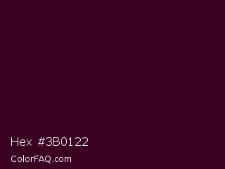 Hex #3b0122 Color is a very dark magenta color and the nearest color is Toledo #3a0020. Hex code #3b0122 and RGB value is rgb(59,1,34). In RGB color space, this color is composed of 23% red, 0% green, 13% blue, In CMYK color space, this color is composed of 0% cyan, 98% magenta, 42% yellow , 77% black , In HSL color space, this color has a hue angle of 326° , 97% saturation and 12% lightness.