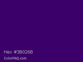 Hex #3b026b Color is a very dark purple color and the nearest color is Christalle #33036b. Hex code #3b026b and RGB value is rgb(59,2,107). In RGB color space, this color is composed of 23% red, 1% green, 42% blue, In CMYK color space, this color is composed of 45% cyan, 98% magenta, 0% yellow , 58% black , In HSL color space, this color has a hue angle of 273° , 96% saturation and 21% lightness.