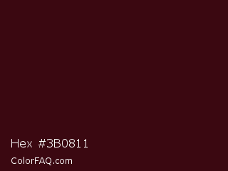 Hex #3b0811 Color is a very dark red color and the nearest color is Aubergine #3b0910. Hex code #3b0811 and RGB value is rgb(59,8,17). In RGB color space, this color is composed of 23% red, 3% green, 7% blue, In CMYK color space, this color is composed of 0% cyan, 86% magenta, 71% yellow , 77% black , In HSL color space, this color has a hue angle of 349° , 76% saturation and 13% lightness.
