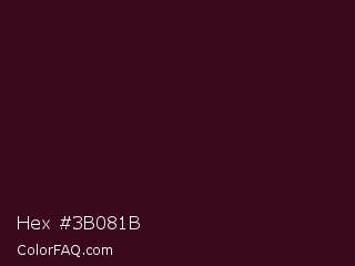 Hex #3b081b Color is a very dark rose color and the nearest color is Toledo #3a0020. Hex code #3b081b and RGB value is rgb(59,8,27). In RGB color space, this color is composed of 23% red, 3% green, 11% blue, In CMYK color space, this color is composed of 0% cyan, 86% magenta, 54% yellow , 77% black , In HSL color space, this color has a hue angle of 338° , 76% saturation and 13% lightness.