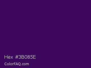 Hex #3b085e Color is a very dark purple color and the nearest color is Jagger #350e57. Hex code #3b085e and RGB value is rgb(59,8,94). In RGB color space, this color is composed of 23% red, 3% green, 37% blue, In CMYK color space, this color is composed of 37% cyan, 91% magenta, 0% yellow , 63% black , In HSL color space, this color has a hue angle of 276° , 84% saturation and 20% lightness.