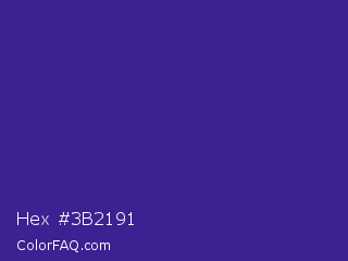Hex #3b2191 Color is a normal indigo color and the nearest color is Pixie Powder #391285. Hex code #3b2191 and RGB value is rgb(59,33,145). In RGB color space, this color is composed of 23% red, 13% green, 57% blue, In CMYK color space, this color is composed of 59% cyan, 77% magenta, 0% yellow , 43% black , In HSL color space, this color has a hue angle of 254° , 63% saturation and 35% lightness.