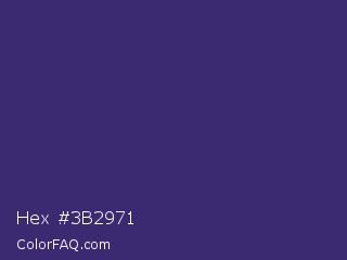 Hex #3b2971 Color is a dark indigo color and the nearest color is Jacarta #3a2a6a. Hex code #3b2971 and RGB value is rgb(59,41,113). In RGB color space, this color is composed of 23% red, 16% green, 44% blue, In CMYK color space, this color is composed of 48% cyan, 64% magenta, 0% yellow , 56% black , In HSL color space, this color has a hue angle of 255° , 47% saturation and 30% lightness.