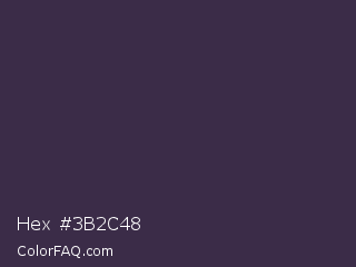 Hex #3b2c48 Color is a dark purple color and the nearest color is Martinique #363050. Hex code #3b2c48 and RGB value is rgb(59,44,72). In RGB color space, this color is composed of 23% red, 17% green, 28% blue, In CMYK color space, this color is composed of 18% cyan, 39% magenta, 0% yellow , 72% black , In HSL color space, this color has a hue angle of 272° , 24% saturation and 23% lightness.